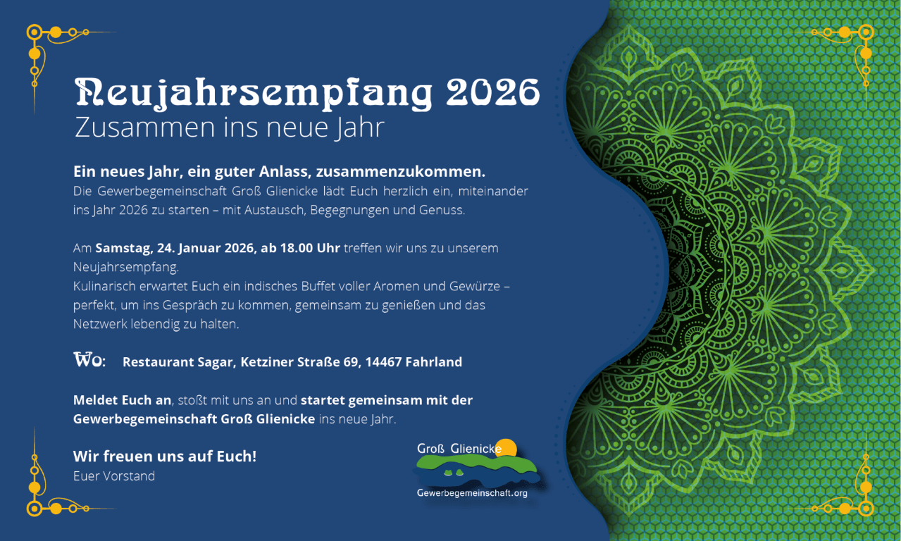Seit 2004 gibt es die Gewerbegemeinschaft Groß Glienicke, die sich als Verbund von hier ansässigen Unternehmen und Dienstleistern für die gemeinsamen Belange einsetzt. Im kollegialen Austausch miteinander entwickeln wir Positionen, mit denen wir die Wirtschaft und die Strukturen in unserer Region fördern wollen.
