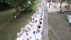 Die ca. 100 Gäste schlüpften – wenn möglich – in etwas Weißes, brachten einen selbstgemachten Kuchen oder eine herzhafte Leckerei zum Teilen mit und nahmen Platz an unserem langen, schön gedeckten Tisch.